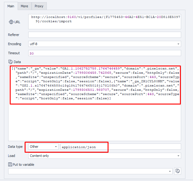 | body | JSON-Array | UUID profiles | Cookies in JSON format [cookie] |
